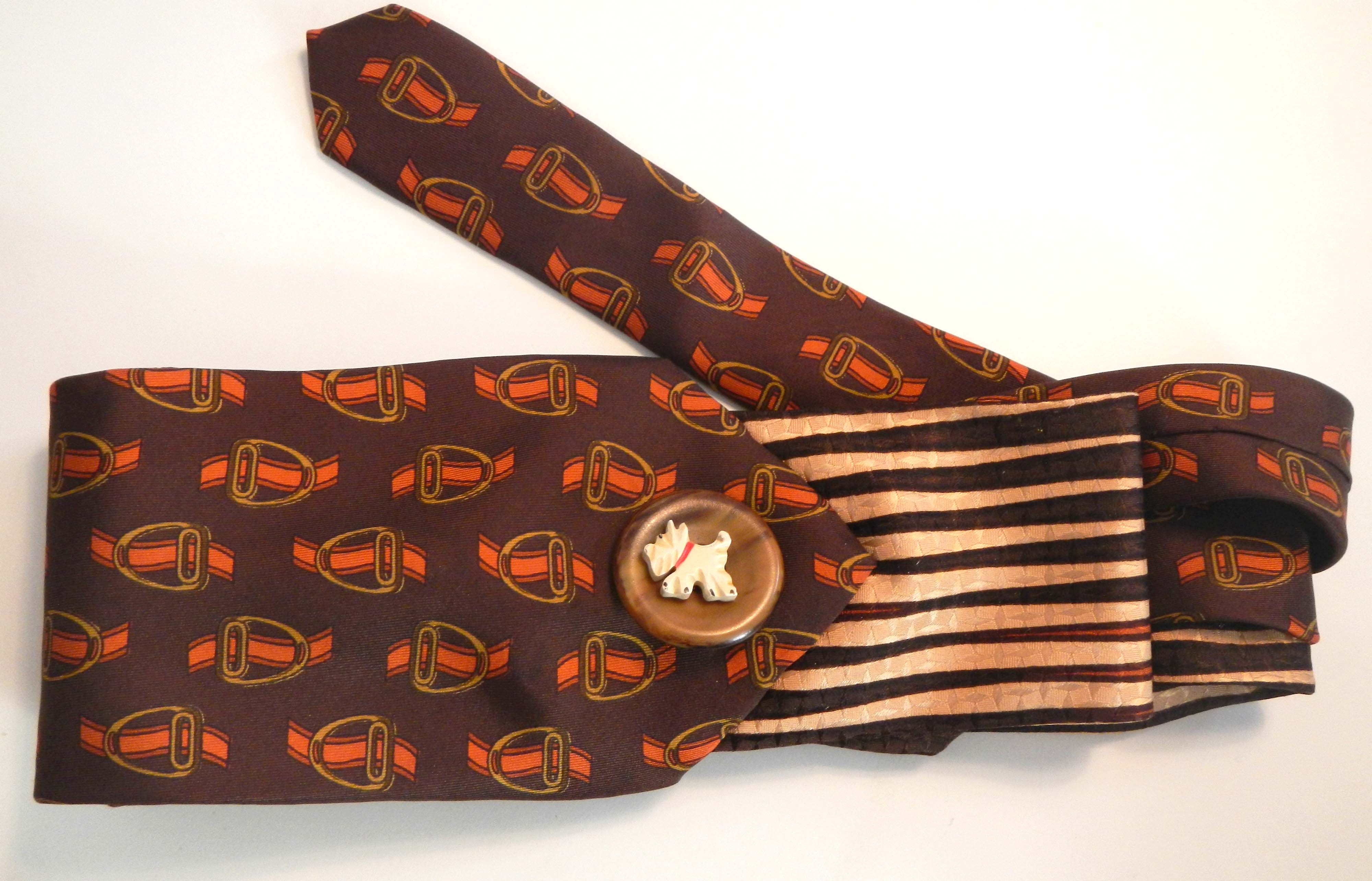 Strange ties from the 1970s are an excellent excuse, when they are joined together and decorated with vintage buttons (like this dog-botton from the ’50), to wear exciting belts. To sprinkle joie-de-vivre to all garments! cinture vintage cucite assieme diventano cinture da legare in vita!