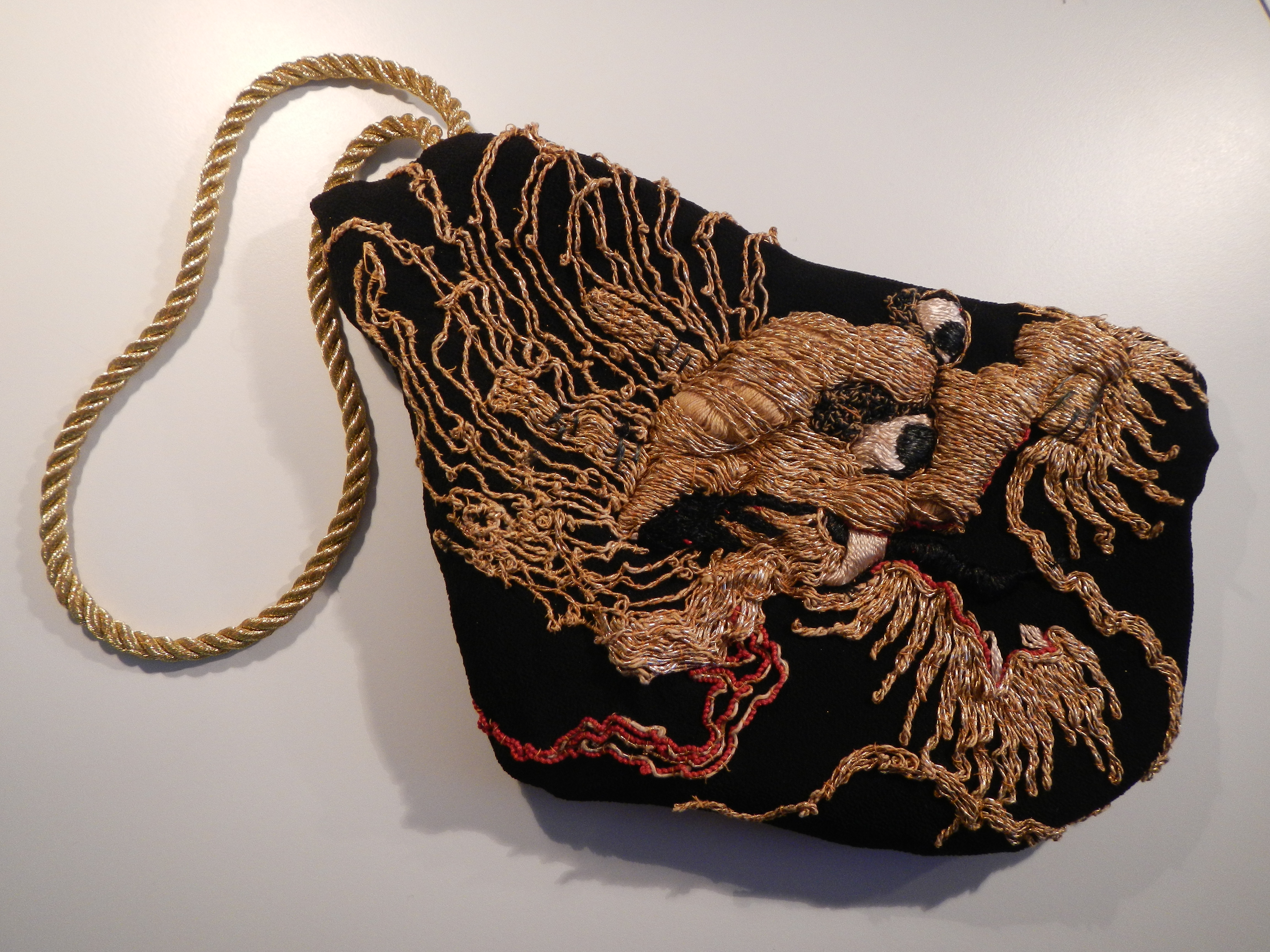 From an antique 1920s Chinese nightgown, embroidered with dragons and clouds, but now reduced to fragments, is born this black silk clutch, padded and lined in black silk. pochette dragone realizzata da un frammento di antica vestaglia cinese di fine ‘800