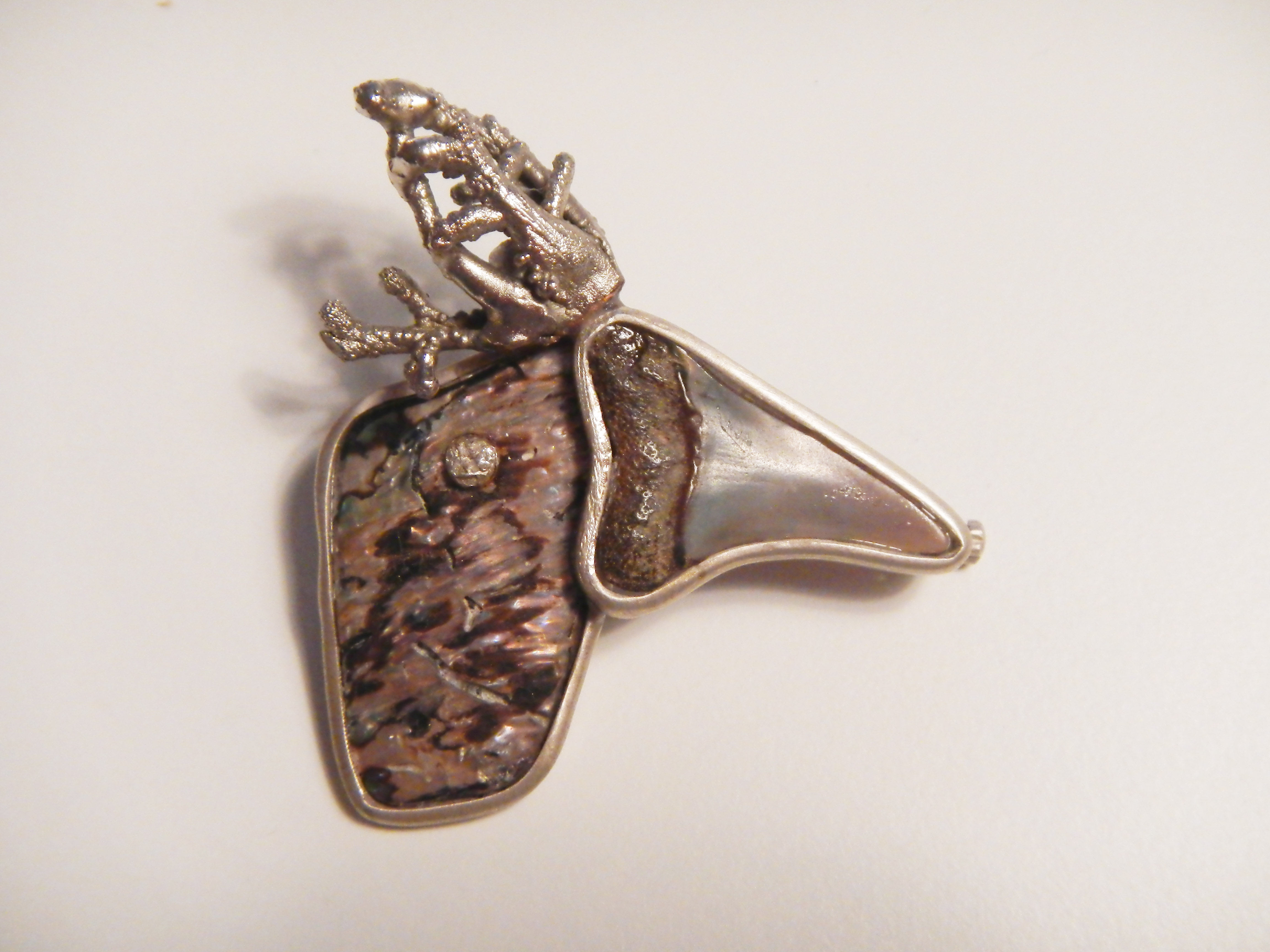 Testa d’oca: frammento di madreperla neozelandese, un dente di squalo dal Perù e un ciuffetto di bacca argentato proveniente dal bosco argentino de Los Arayanes che ispirò Walt Disney per il bosco di Bambi, nasce la testa di upupa-renna! Spilla con rifiniture in argento.